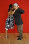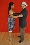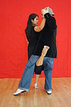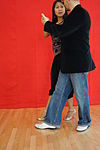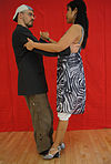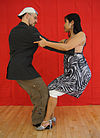 女性がリーダーの腕に支えられながら横に傾き、軸を外れた動き。 | ![]() |