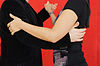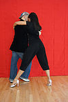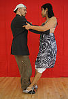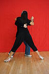 スタイルミロンゲロ | ミロンゲロスタイルの抱擁は閉じた位置で胸から胸まで踊り、パートナーがわずかに互いに寄りかかって(または寄りかかって)足を動かすスペースを確保します。リーダーの肩に対するフォロワーの左腕の位置は、スタイルの問題です。それは、あなたが文字通り「正方形」で踊っているほど多くの人々がいる混雑したミロンガで始まり、使用されています。これらの場所では、持ち上げられた腕は、ターン中に他の人に触れたり、誤って怪我をしたりするのを防ぎます。V字型ではなく、抱擁を閉じます。 | ![]() |