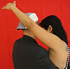 女性がジャンプしたり持ち上げたりするのを助ける男。 | ||